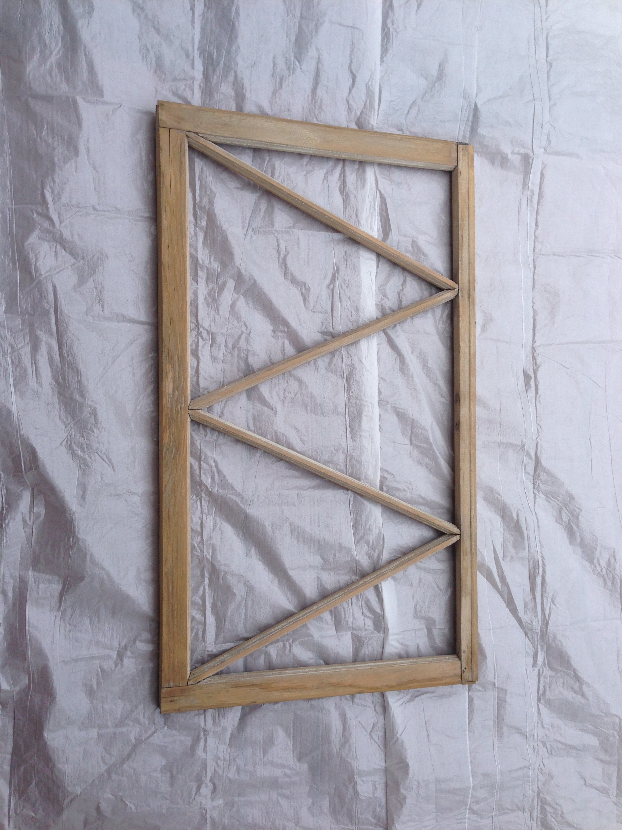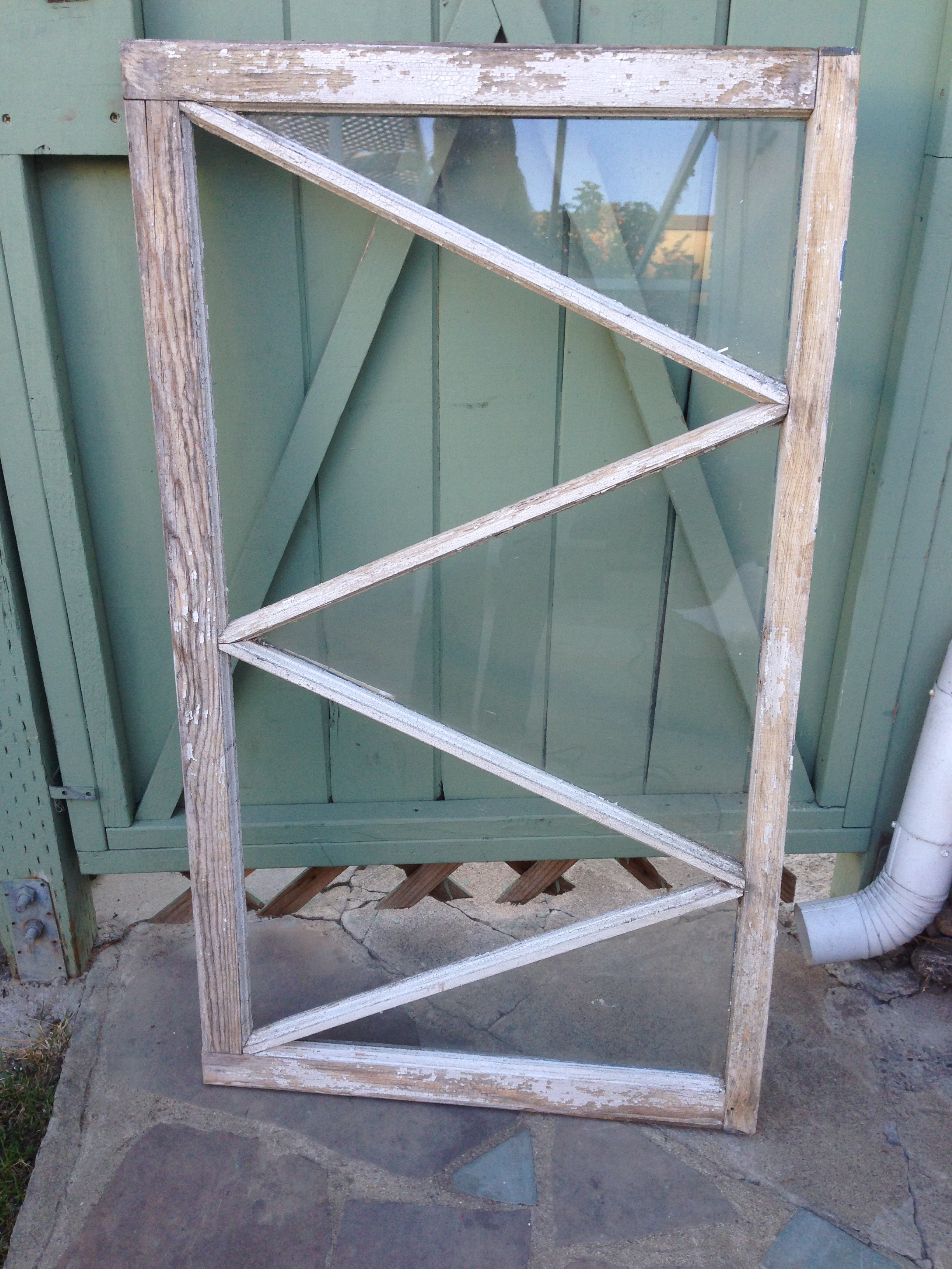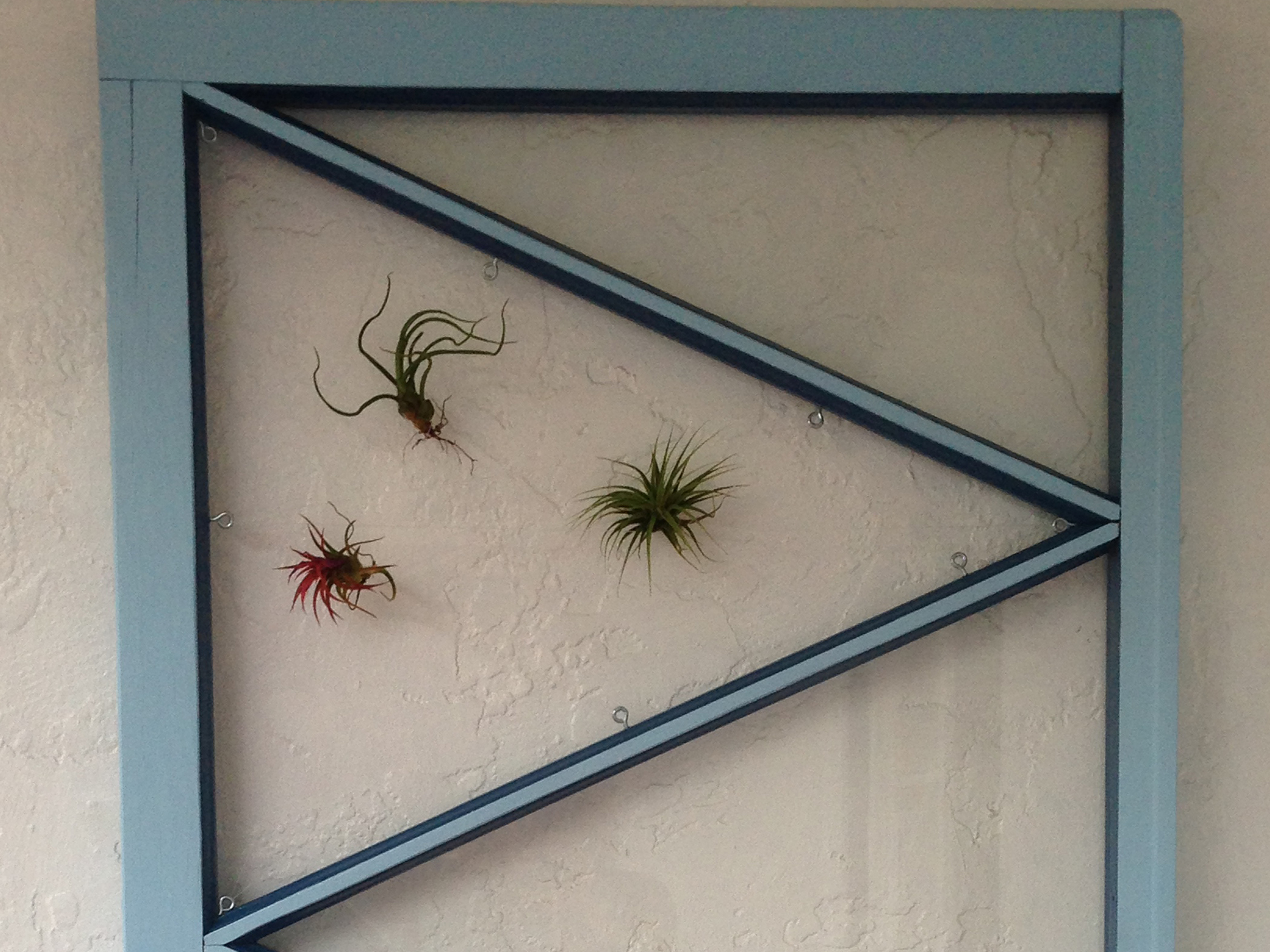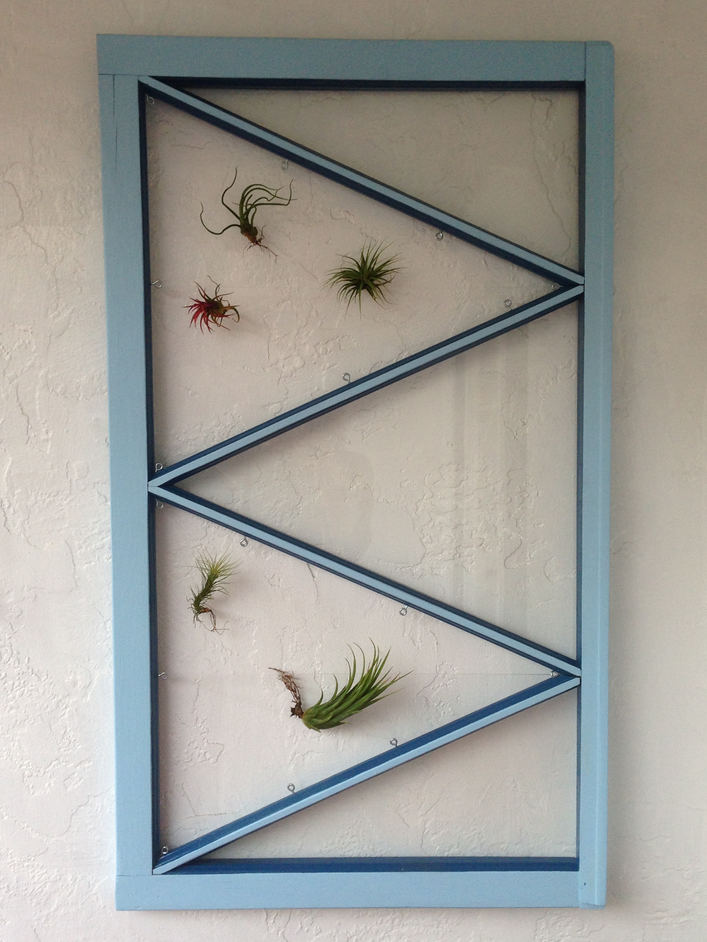 One day I was visiting Antique stores in Joshua Tree and came upon this adorable little store that made custom terrariums. Glass terrariums to hold air plants, succulents and the like. They had this great way to display their air plants. They had built a frame and then simply strung fishing line back and forth to hold the air plants suspended in the air. I loved the concept. A few stores later I happened upon an antique store with an old zig-zag style window and whammo! I could use this amazing window and build it to hold my air plants with fishing line!
