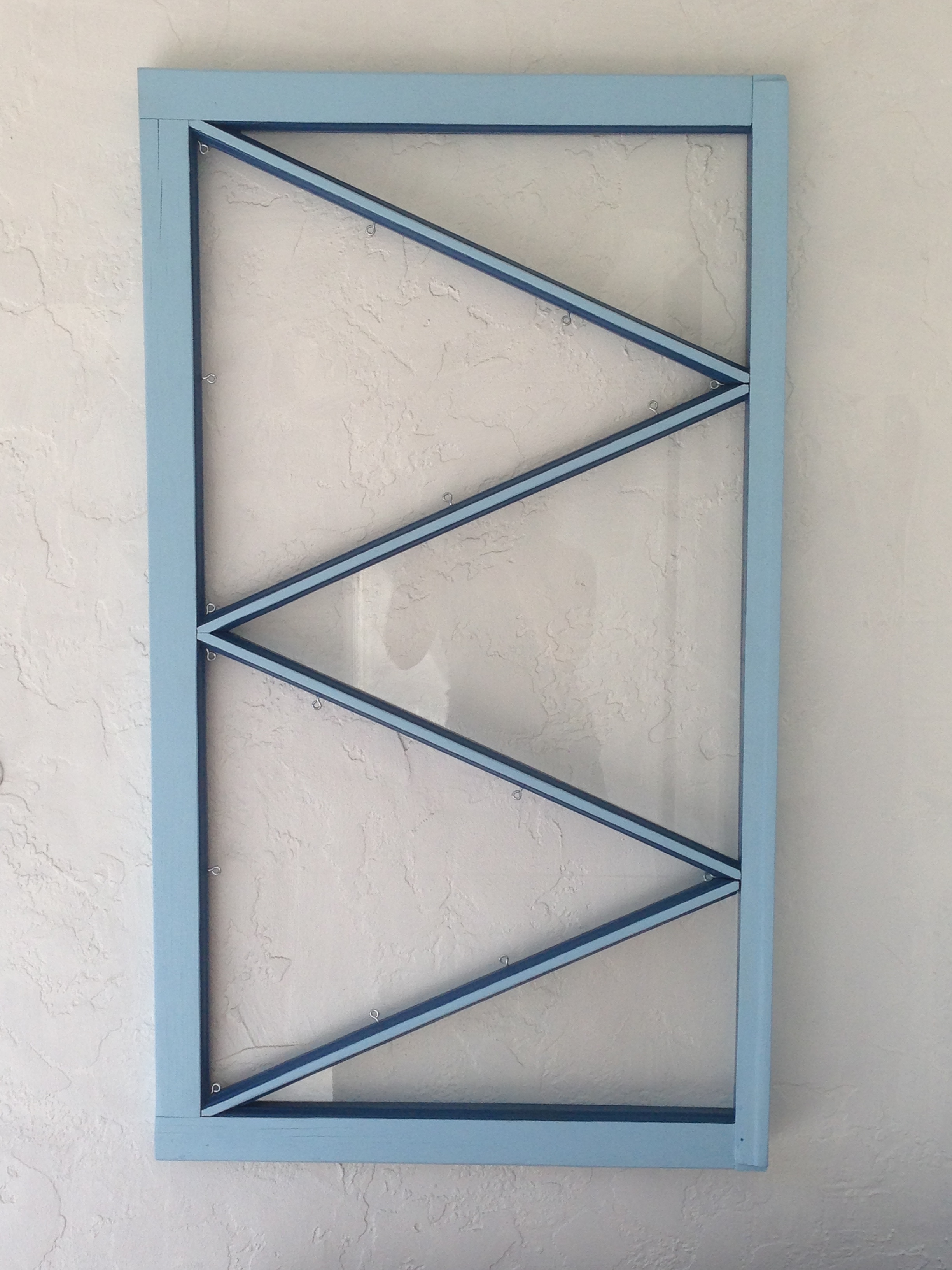 Hooks: Once the frame is completely dry, using an appropriate sized drill bit, drill the holes in the frame through the panes and screw in the eye hooks. You’ll want to space them out and make sure you use enough that you will have a pretty cool pattern once you string the fishing line.
