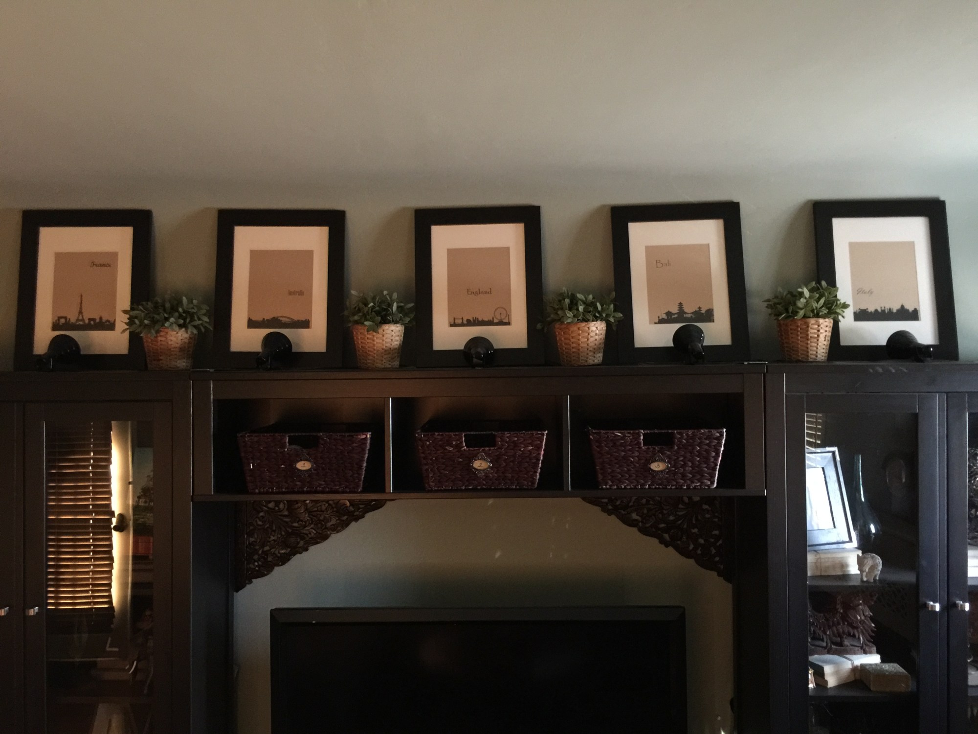 To create the silhouettes I located artwork of each of the cities I wanted to go to online. I added the city name in a font that seemed in line with the style of that city. And I printed them onto brown craft-like paper. I put them into frames with mats from Ikea and placed them across the top of the unit.