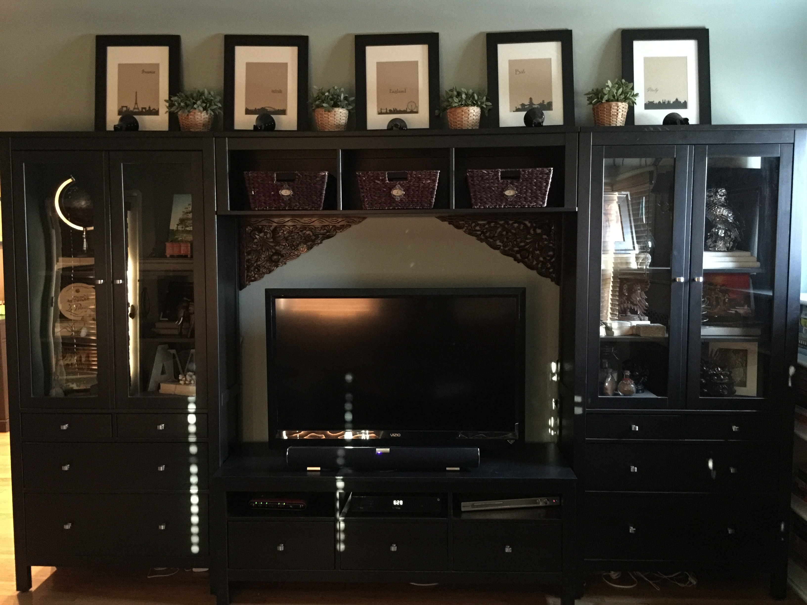 When I finally upgraded to a flat screen TV it forced me to buy a new entertainment center. And when buying a new entertainment center it forced me to re-do my decorations. It’s always a can of worms isn’t it? I ended up expanding from a 2-shelf corner unit, to a dual glass cabinet unit with a shelf bridge between them. The unit all together spanned an entire wall. It is massive.