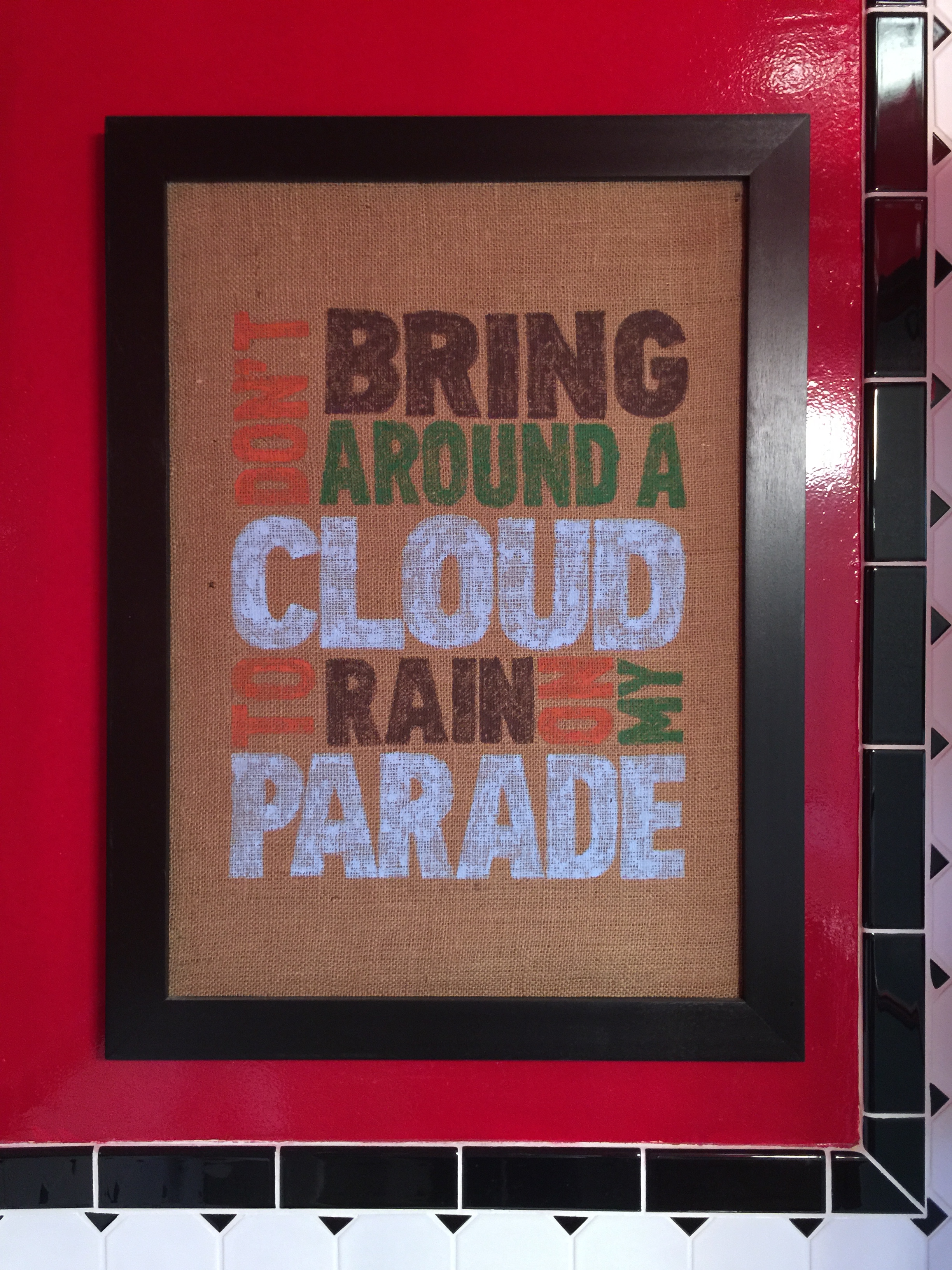 Last step was to hang on the wall, step back and enjoy! This piece is now hanging over the toilet in my bathroom, so anyone that comes over and uses the facilities can be reminded not to rain on my parade!