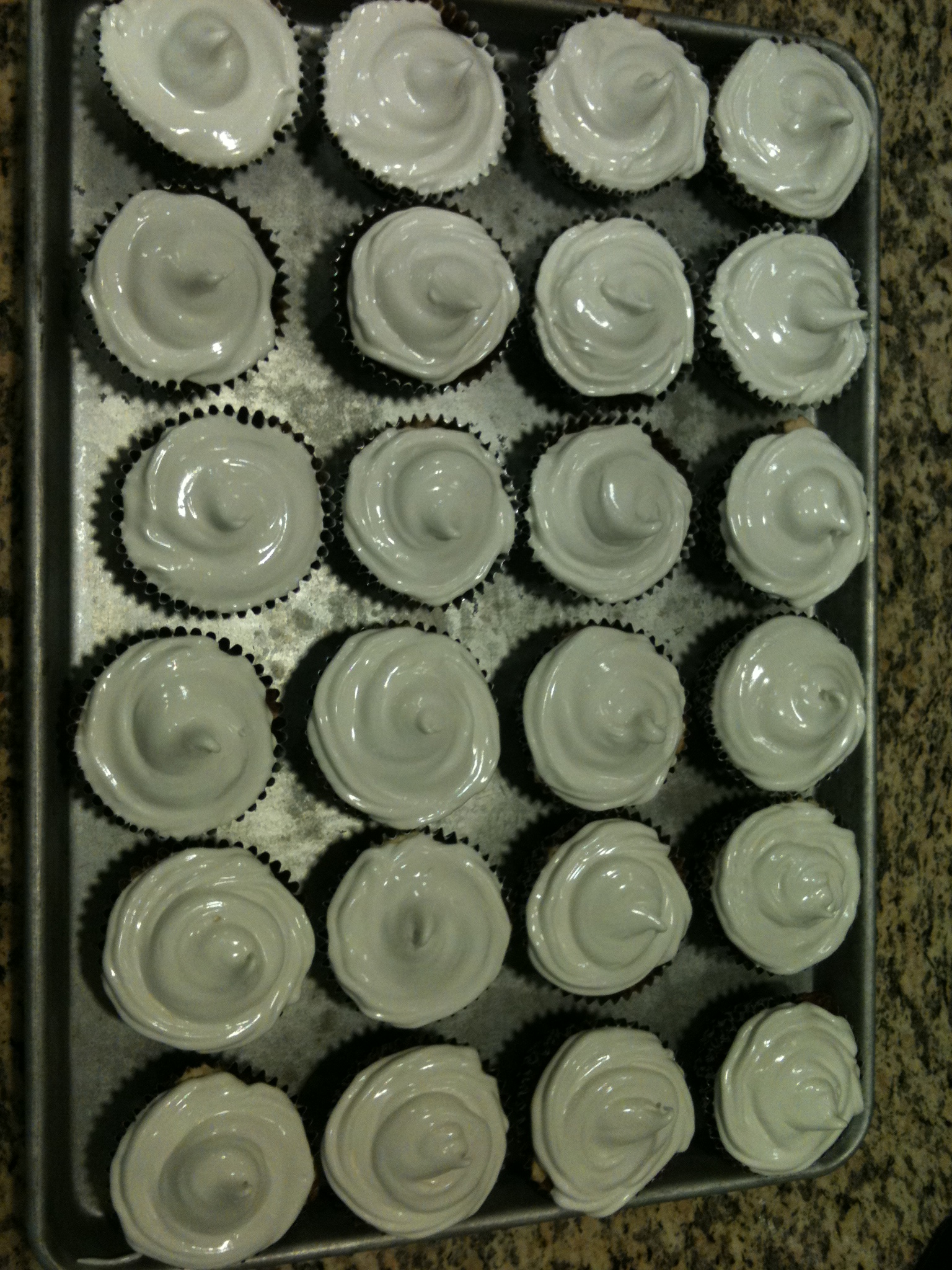 Cake Batter: Prep the cake batter per the recipe. Before adding to the cupcake liners, add 3 mini marshmallows to each cupcake liner/crust as well as some chopped chocolate chunks. Then top with the batter. Note the marshmallows will float to the top – just let ‘em. Pop them into the oven to bake. Set aside to cool once done.