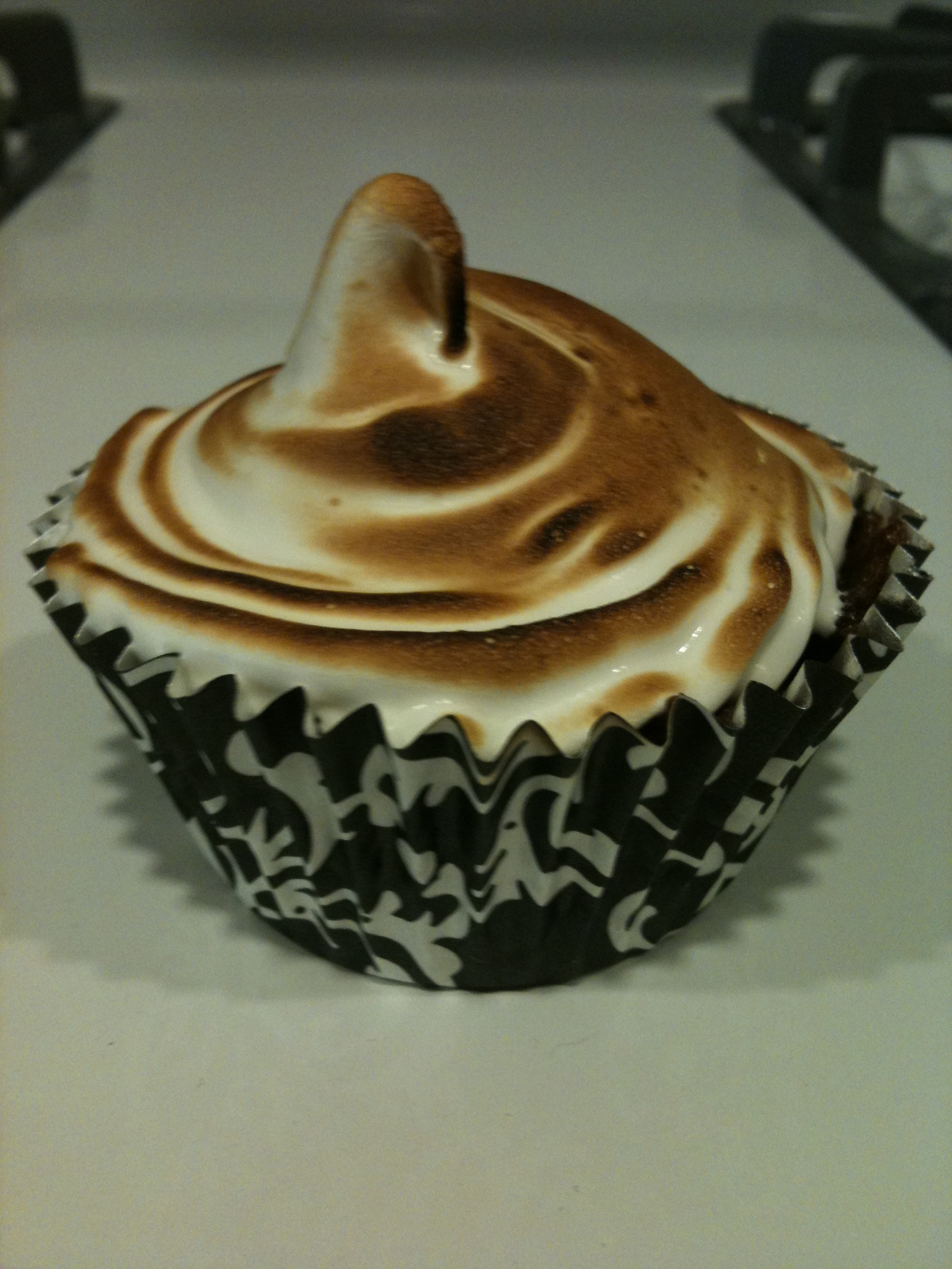 Decorating: I used a regular piping bag to neatly get the marshmallow crème onto the cooled cupcakes. It might be a little runny, but do the best you can to keep it in the middle and make a pretty swirl. Now the fun part – that you’ve been waiting for – TORCHING!