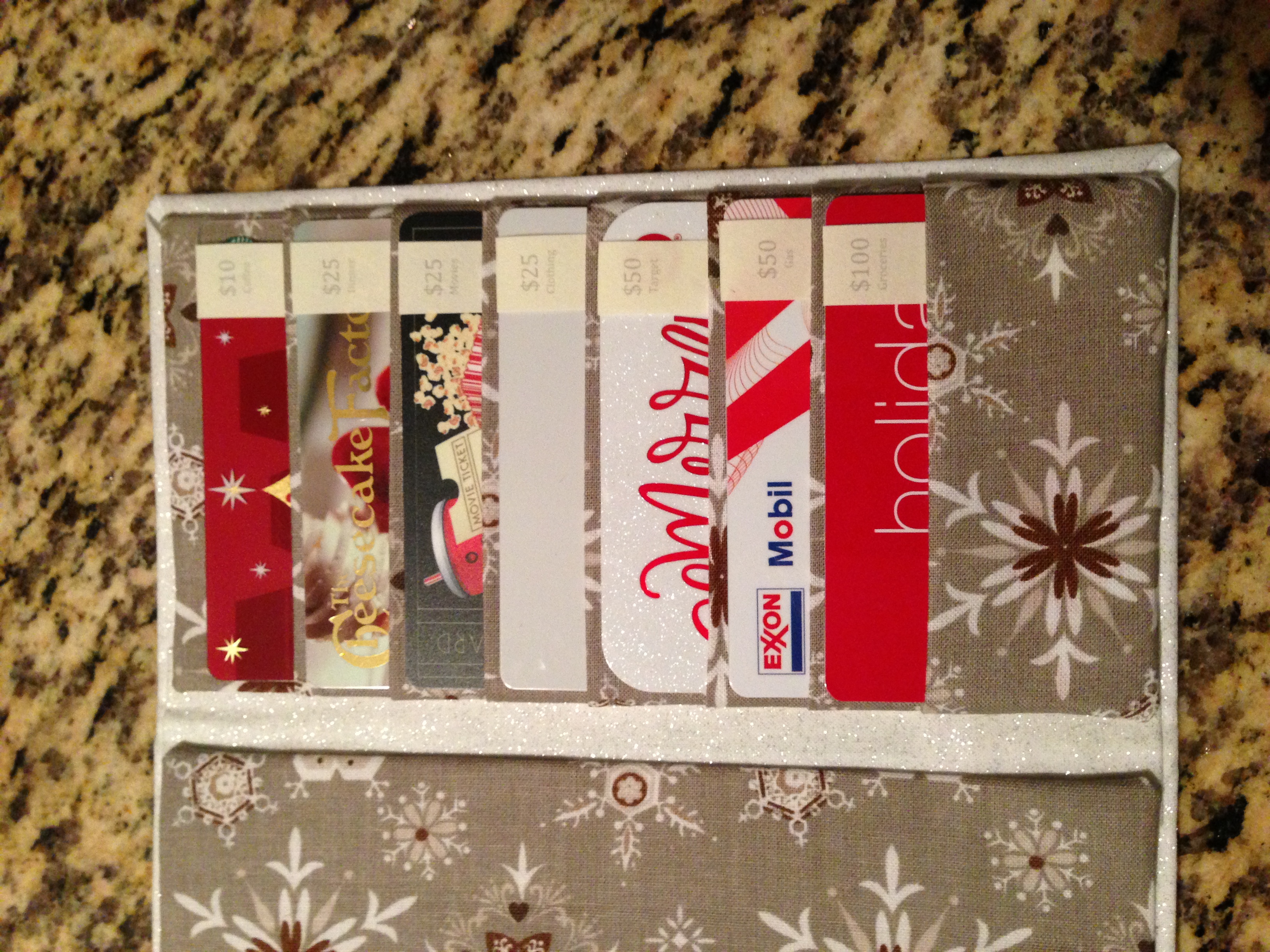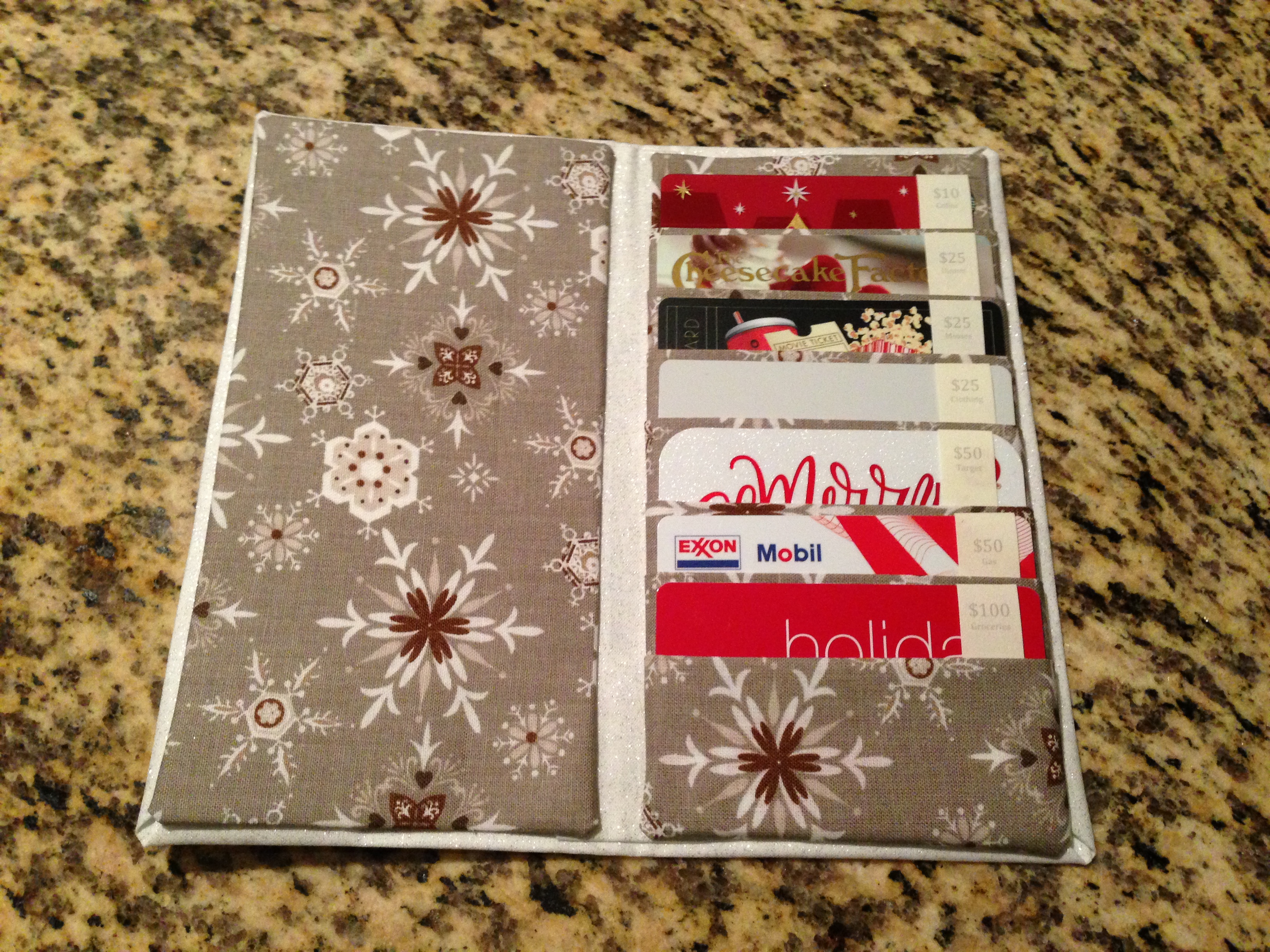 I wrapped this gift card wallet like a present to present it to the recipient – that way she had something to open on Christmas morning – more than a card.