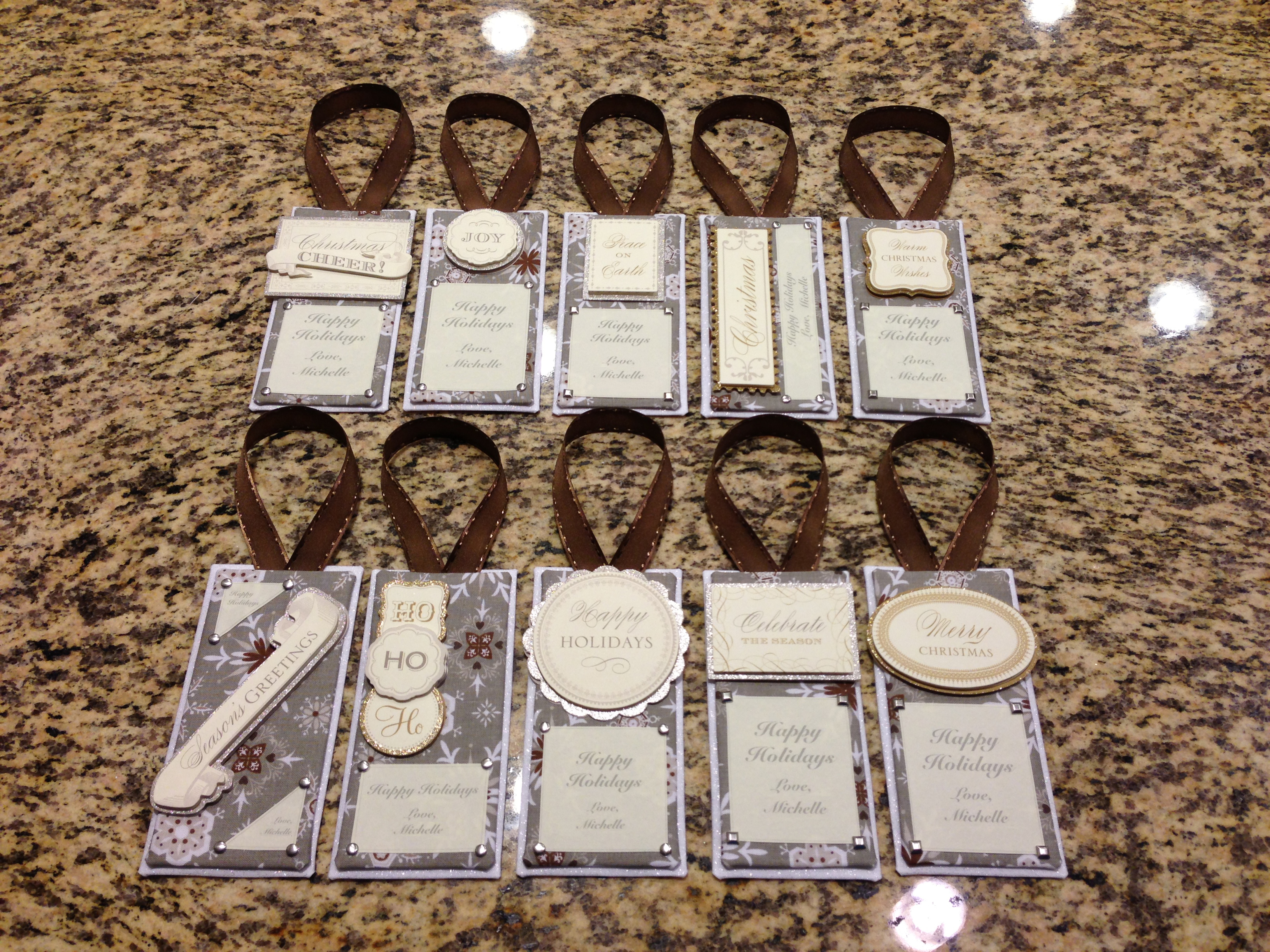 I simply wrapped the cardstock with the fabric, printed out tags with varying holiday messages on them and added the embellishments. I sandwiched a ribbon between the front and back with glue and voila!